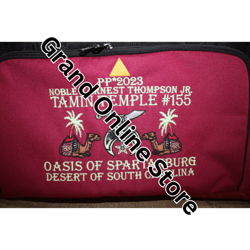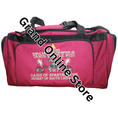 Custom embroidered travel duffel bag is a vibrant and durable choice for your journeys. Featuring the intricate design of Tamin Temple #155 and the Oasis of Spartanburg.